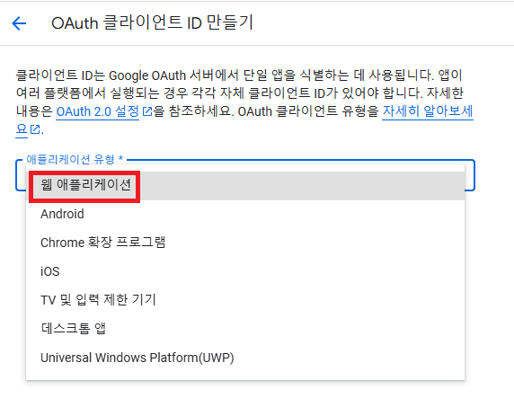 웹 애플리케이션을 선택합니다.