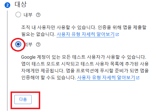워크스페이스 계정이면 [내부]가 설정 가능 하지만 개인개정은 [외부]만 선택 가능합니다.
