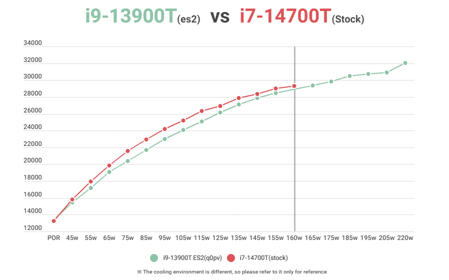 i9-13900T es2(q0pv)와 소모전력별 시네벤치를 비교한 그래프