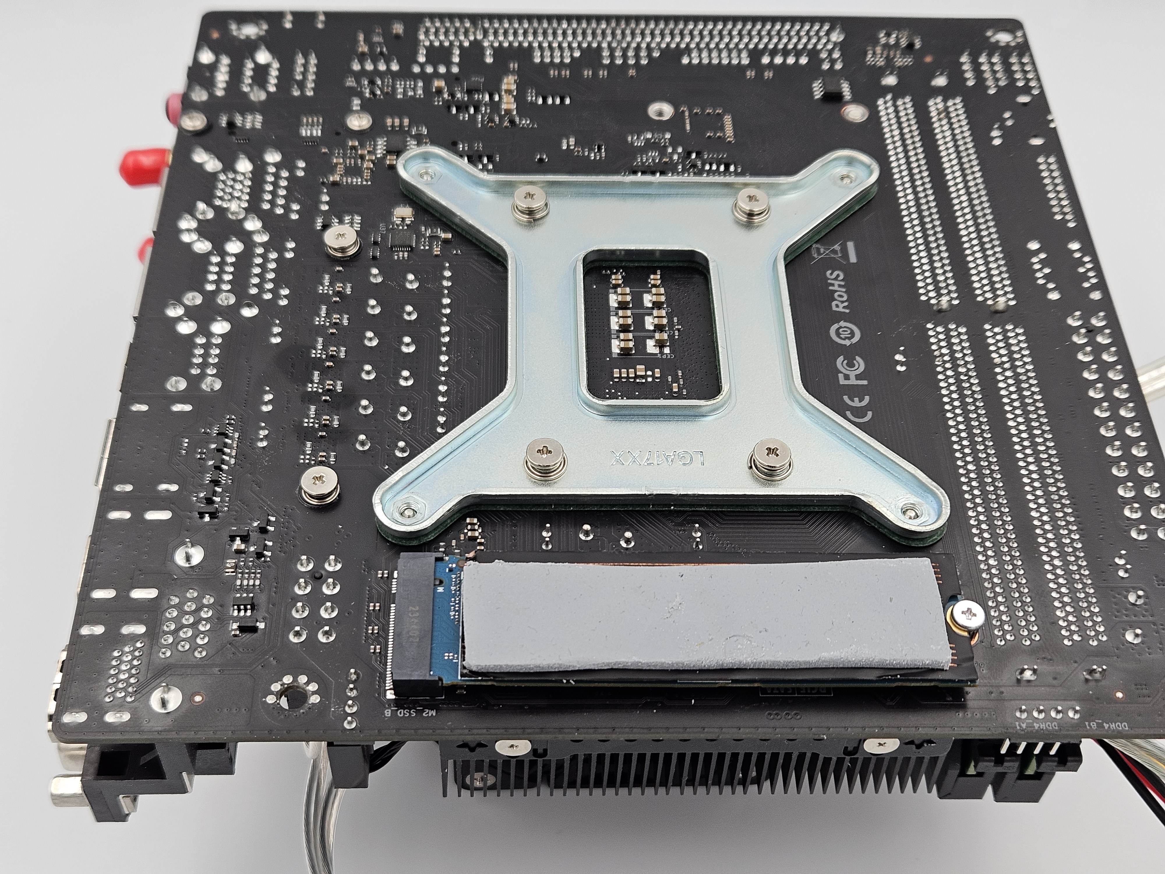 보드 후면부 SSD는 케이스의 측면판에 열이 전도될수 있게 써멀패드를 부착했습니다.