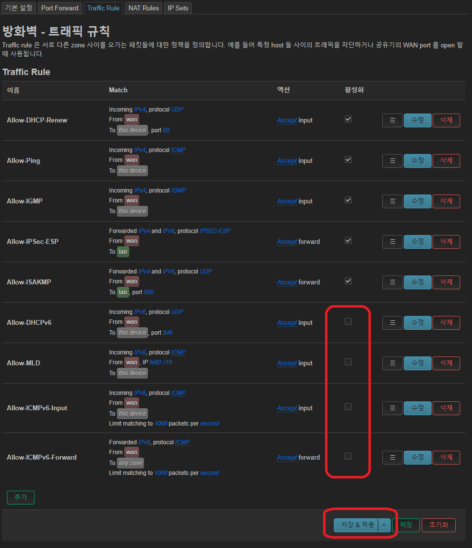 IPv6 전용 서비스들을 비활성화 후 저장 & 적용을 누릅니다.