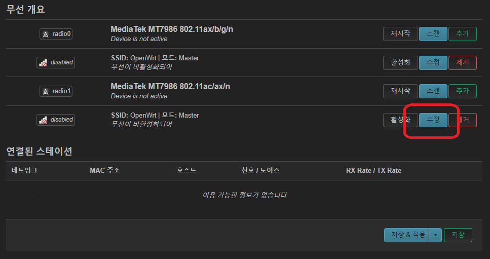 radio0 아래에 있는것이 2.4Ghz 대역 설정, 1 아래에 있는것이 5Ghz 대역 설정 입니다.