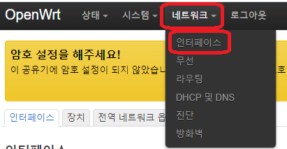 상단 네트워크 탭 의 인터페이스 메뉴를 들어갑니다.