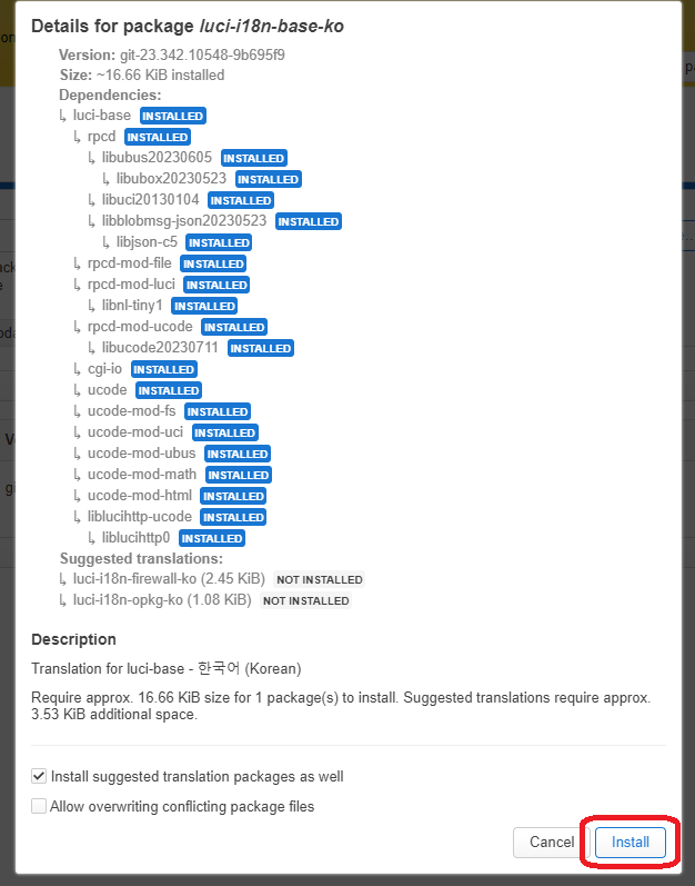 "luci-i18n-base-ko" 라는 패키지가 나옵니다. 우측의 Install을 눌러 설치 합니다.