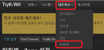 네트워크 - 방화벽 메뉴의 기본 설정 탭에서 설정 합니다.