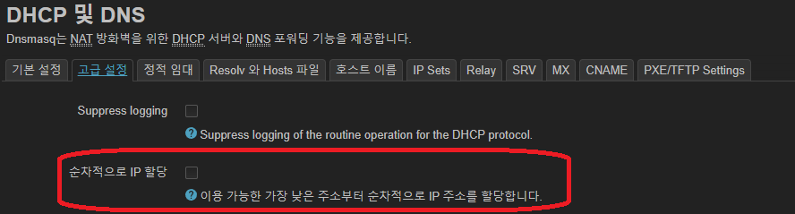 고급 설정 탭에서 순차적으로 IP 할당에 체크를 하게 되면, DHCP가 IP를 번호 순으로 부여 합니다.