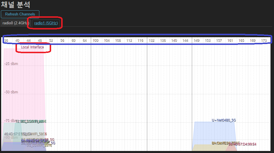 신호가 강력하기는 하지만, 인근 공유기와 겹치지 않는 채널을 골라보겠습니다.