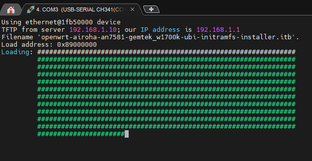 setenv serverip 192.168.1.10 ; setenv ipaddr 192.168.1.1 ; tftpboot 0x89000000 openwrt-airoha-an7581-gemtek_w1700k-ubi-chainload-uboot.itb
