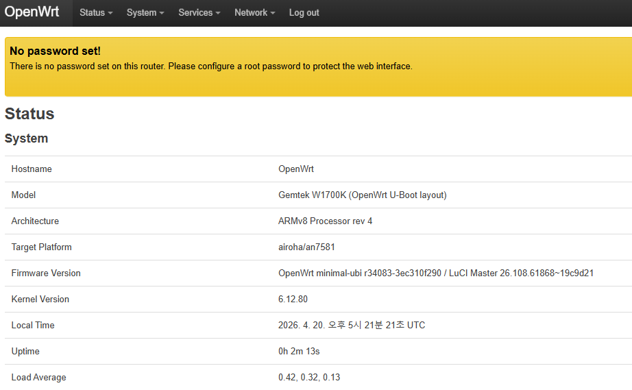 부팅용 스냅샷 펌웨어가 설치 완료 되면, 192.168.1.1로 접속하면 OpenWRT 메인 화면을 볼 수 있습니다.