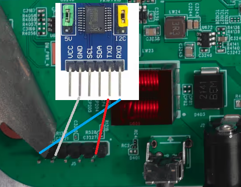뜯으면 포트부분 쪽에 사진과 같은 5핀 디버그 단자가 있습니다.